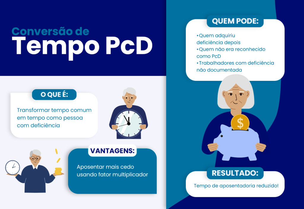 A conversão de tempo para PcD permite que segurados com deficiência transformem seus períodos de trabalho sob condições comuns em tempo especial, usando fatores de multiplicação definidos em lei.