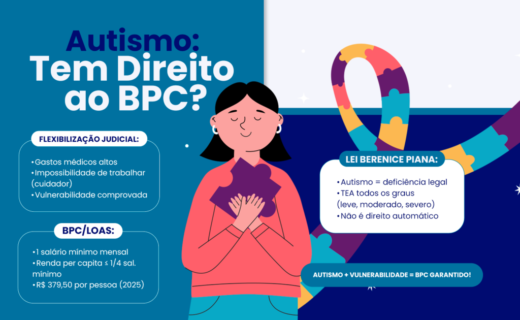 Entre os beneficiários potenciais do BPC, estão as pessoas com Transtorno do Espectro Autista (TEA), uma vez que a Lei Berenice Piana (Lei nº 12.764/2012) reconhece o autismo como uma deficiência para todos os fins legais.